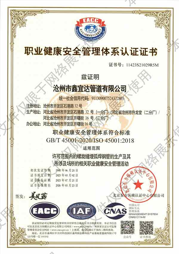 滄州市鑫宜達管道有限公司成立于2003年7月,坐落于滄州經濟開發區,占地面積40萬平方米,注冊資金1.81億元,是集螺旋鋼管生產、防腐加工以及無縫鋼管、卷板、帶鋼等品類鋼材經營銷售于一體的工貿型企業。公司現有員工400多人,其中,中高級技術職稱的人員達120余名。 滄州市鑫宜達管道有限公司擁有9條螺旋鋼管生產線和3PE防腐生產線,可生產直徑219--3640mm,壁厚5.5--28mm,最高鋼級X100的各種規格防腐螺旋鋼管...
